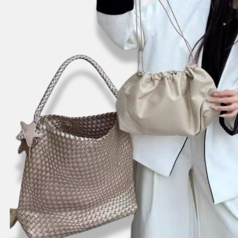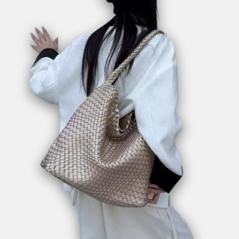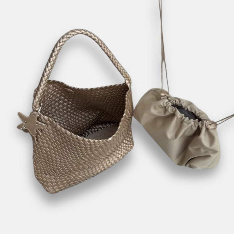 Champagne Woven Tote Bag – Large-Capacity Bucket Shoulder Handbag