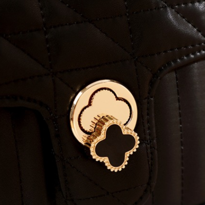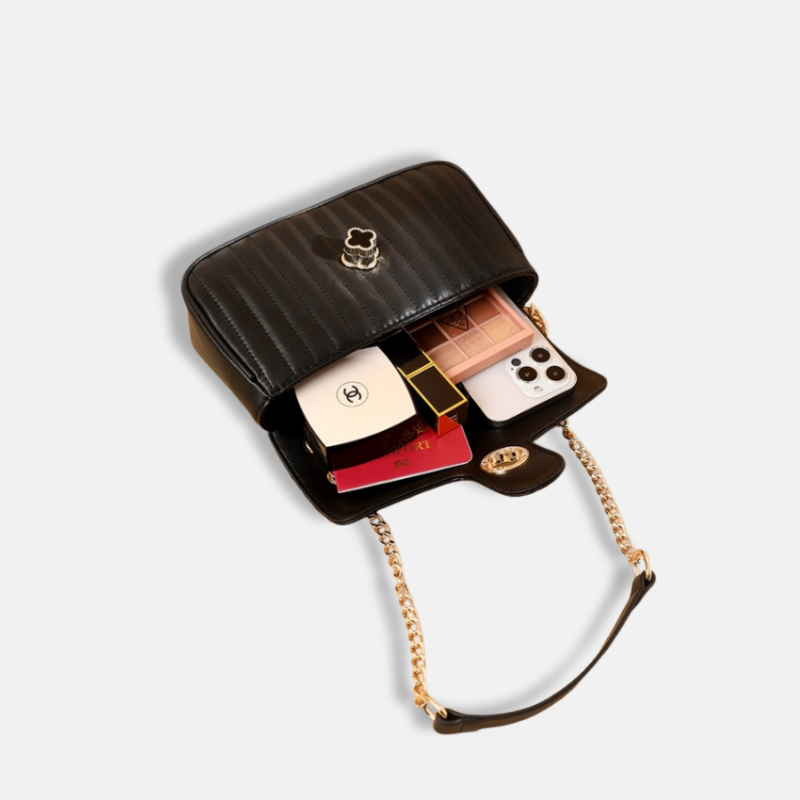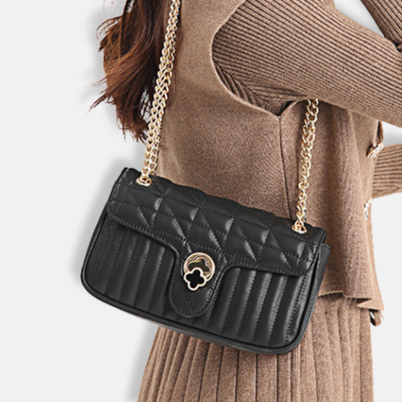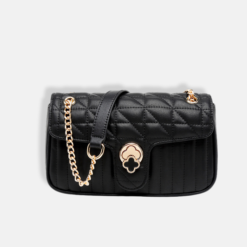• Chic Gold-Tone Accents: Chain strap and clover lock add sophistication
